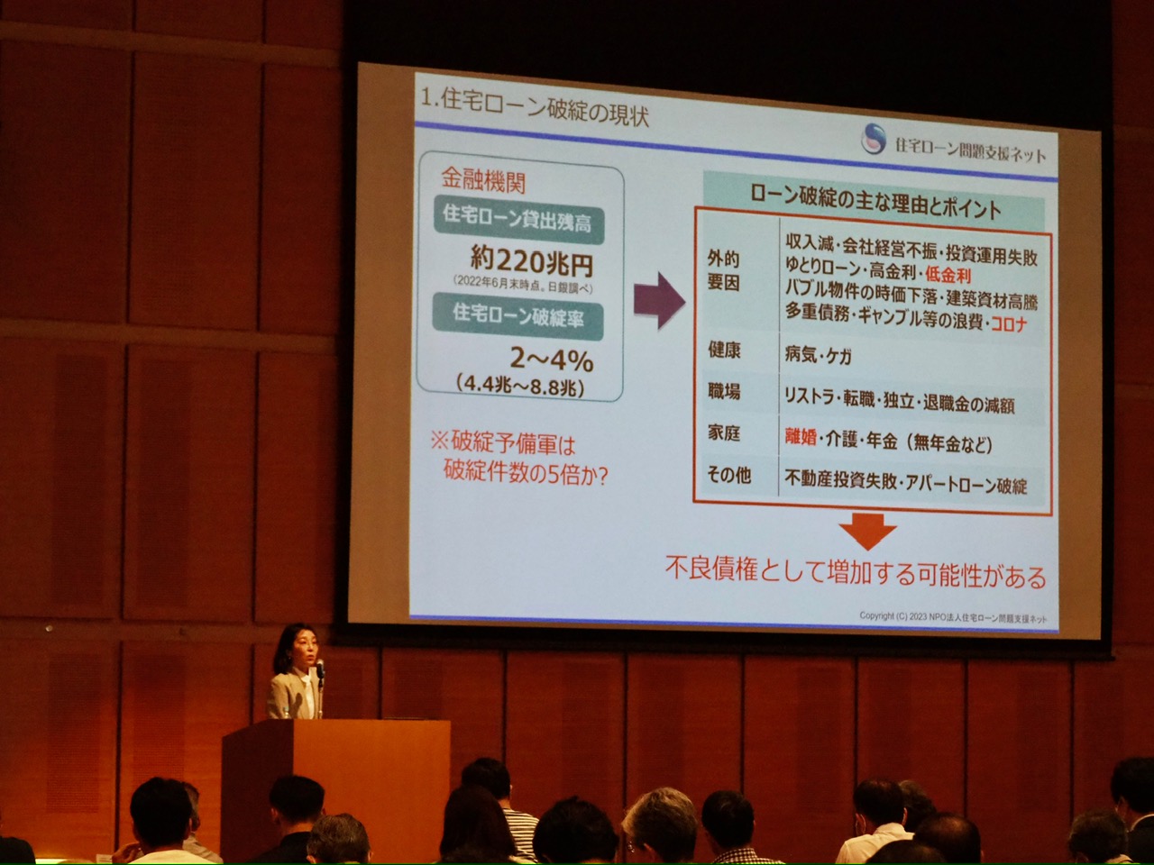 住宅ローンを払えなくなった時にどんな対処方法がとれるのか、具体的な事例も交えながら説明いただきました。