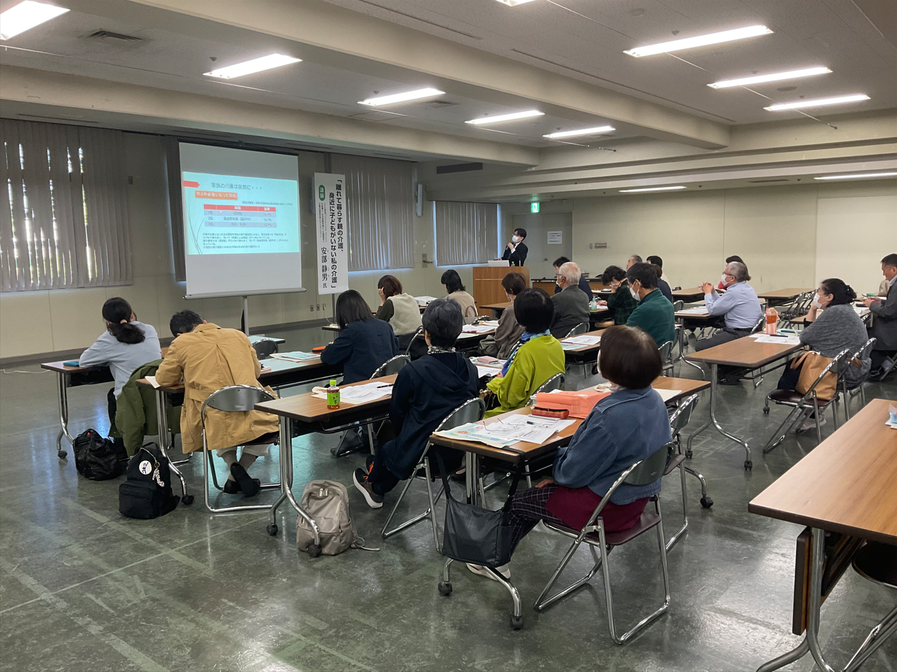 メインセミナーに先立ち、地元FPの安部静男氏によるセミナー「離れて暮らす親の介護、身近に子どもがいない私の介護」を開催しました。介護保険制度の概要や介護サービスの種類、利用方法等を解説いただき、遠距離介護に備える知識を深めていただきました。