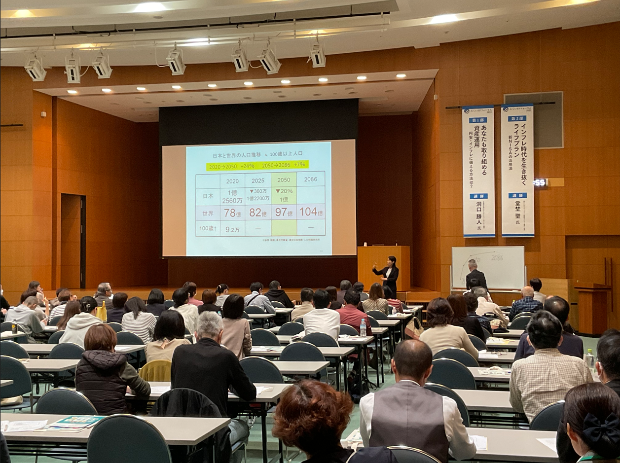 13:30よりセミナー「あなたも取り組める資産運用〜円安・インフレに備える方法は?」を開催しました。CFP®(ファイナンシャル・プランナー)の洞口勝人氏に人口推移や個人金融資産の現状等をご解説いただき、資産の見える化や正確な知識を増やすことで正しい判断につながるよう理解を深めていただきました。