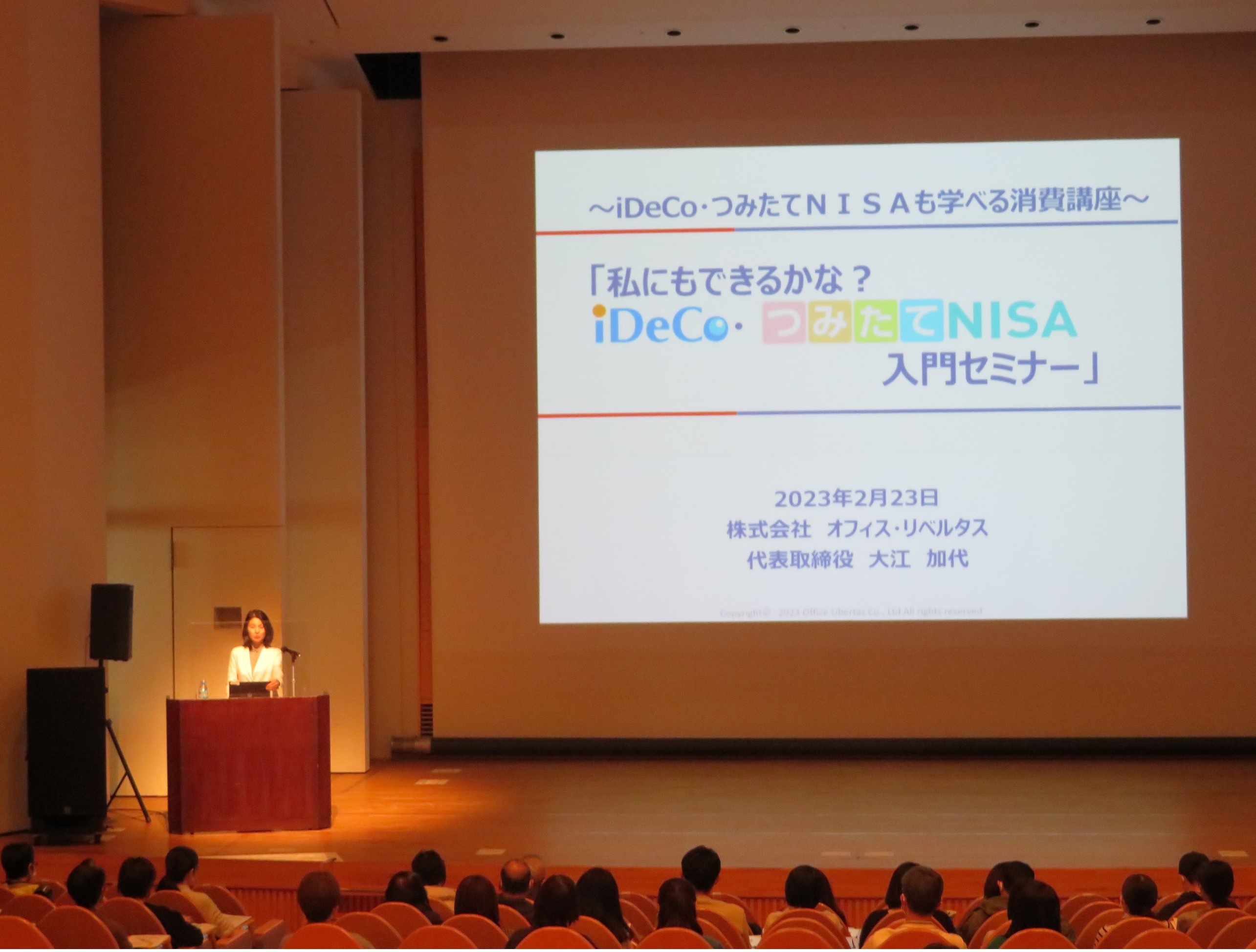 私にもできるかな?…のサブタイトルがついた入門セミナーは、家族同伴の方もいらっしゃる中で、iDeCoと2024年度からの新制度を含むNISAについて、大江講師よりわかりやすく丁寧に解説していただきました。