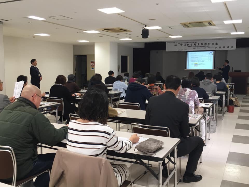 「人生100年時代を幸せに生き抜く為に〜今日から考える自分年金」と題した講演会に40名程が参加、税制改正とiDeCoの仕組みの話に熱心に耳を傾けていました。